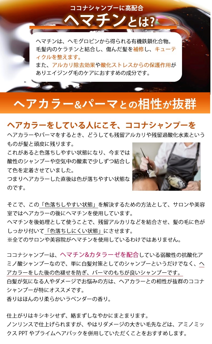 ココナシャンプーは、髪の健康と美しさをサポートするアミノ酸シャンプーです。髪に優しい成分で作られ、濃密な泡が頭皮と髪にまとわりついてくれます。髪と地肌を同時に潤し、傷つきやすい髪をケアします。